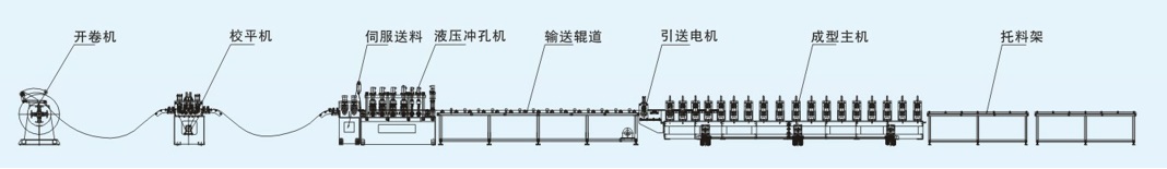 TF光伏支架C型鋼冷彎生產(chǎn)線由開(kāi)卷機(jī)、校平機(jī)、伺服送料機(jī)、沖孔機(jī)、輸送導(dǎo)道、成型主機(jī)、托料架組成。