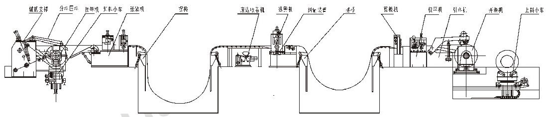 生產(chǎn)線主要由上料小車、開卷機(jī)、校平機(jī)、縱剪、廢邊收卷機(jī)、張緊機(jī)、收卷機(jī)、卸料裝置等組成。
